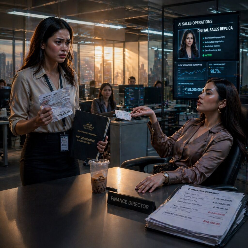 “Mula ngayon,” sabi niya, “kapag ang deal ay naisara sa tulong ng digital replica ng empleyado, ninety percent ng commission mapupunta sa digital side. Ten percent lang sa actual employee.”
