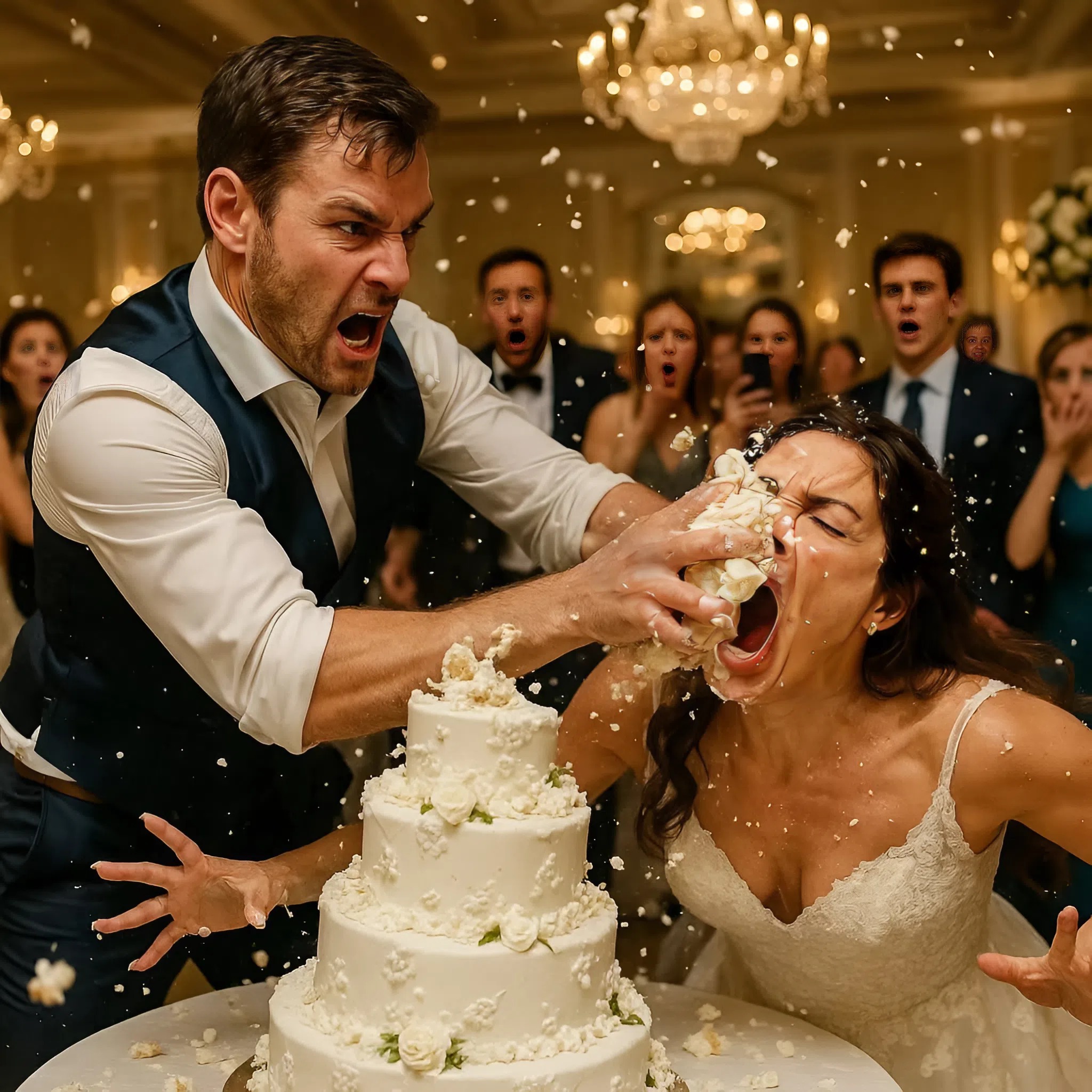 One moment, the guests were cheering for the cake-cutting — the iconic moment every wedding album cherishes. The next, they were frozen, forks mid-air, as the bride stood with buttercream dripping from her lashes, pearls splattered across her chest, her once-perfect veil torn sideways.
