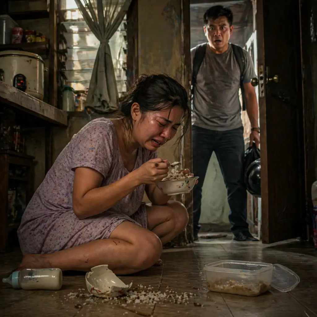 Nakatayo sa may pinto si Marco, pawisan pa, hawak ang bag niya, nanginginig ang panga habang nakatingin sa akin—ako na gusot ang buhok, namumutla, nakaupo sa malamig na sahig ng kusina, at may bahid ng luha sa pisngi at kanin sa kamay.