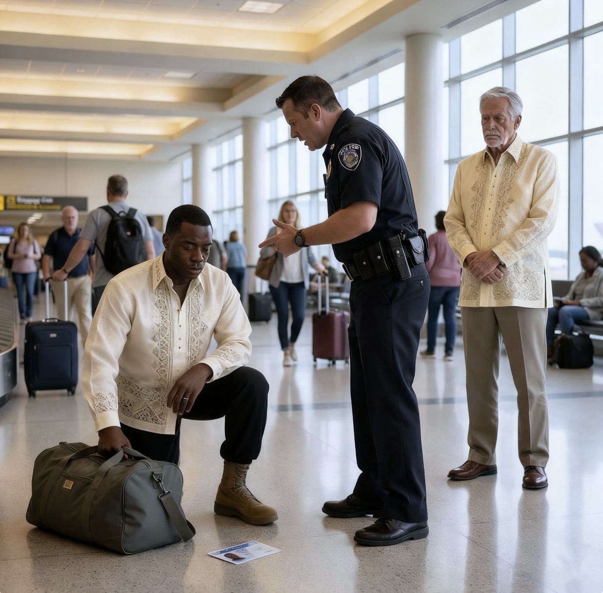 And so, a returning soldier—a recipient of the Bronze Star and a combat medic who had saved lives under fire—found himself pressed against the floor of an airport terminal. Three police officers surrounded one black soldier. The crowd watched, phones out, but no one moved to help.