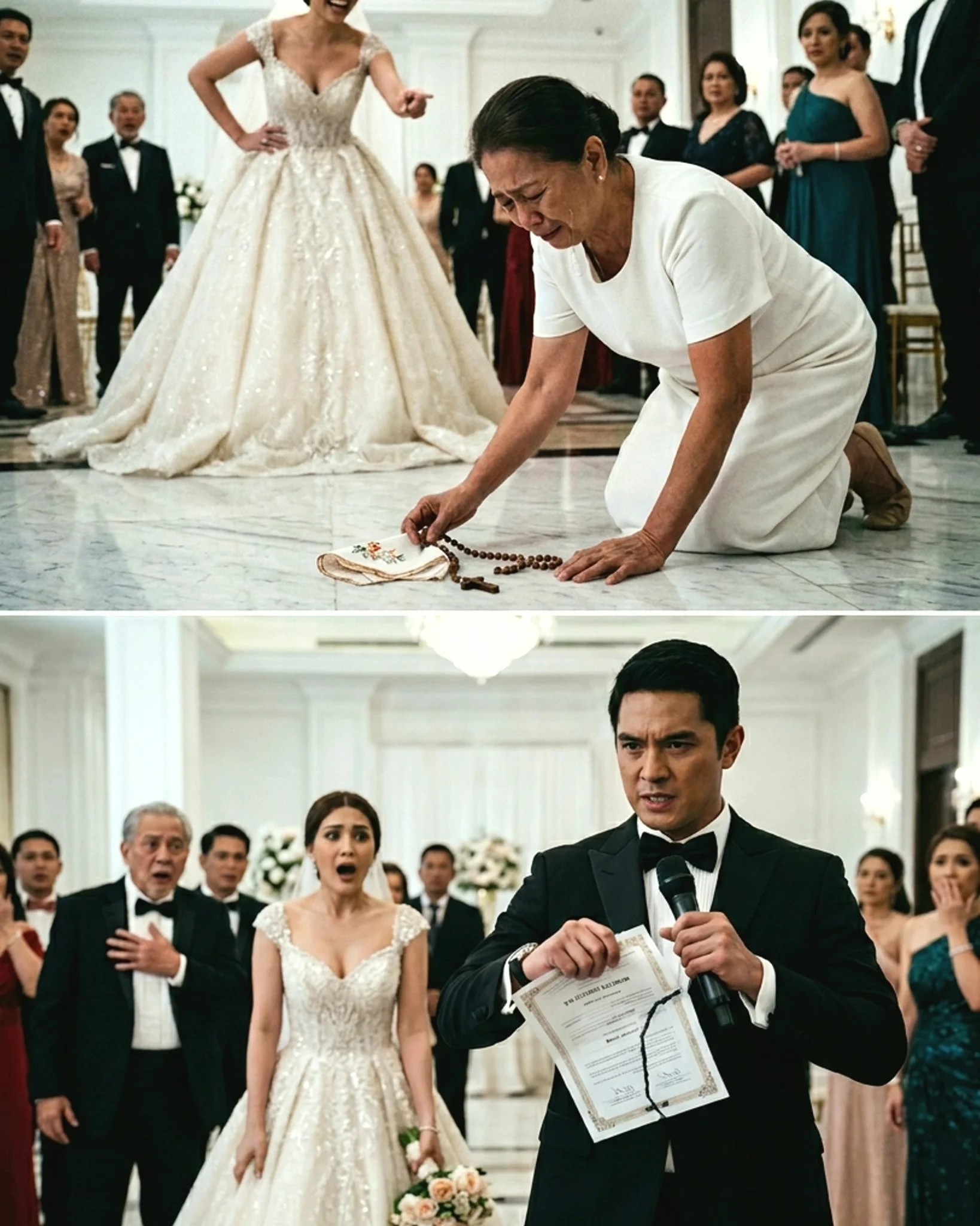 “My gosh! Ano ‘to?! Basura?!” matinis na tili ni Valerie, sapat para marinig ng buong ballroom. Tiningnan niya si Lola Rosa mula ulo hanggang paa. “Lola, alam niyo bang ang isang baso ng wine sa hotel na ‘to ay mas mahal pa sa buhay niyo? Tapos bibigyan niyo ako ng lumang kahoy na rosaryo at basahan?! Anong gagawin ko rito? Pamunas ng sahig?!”