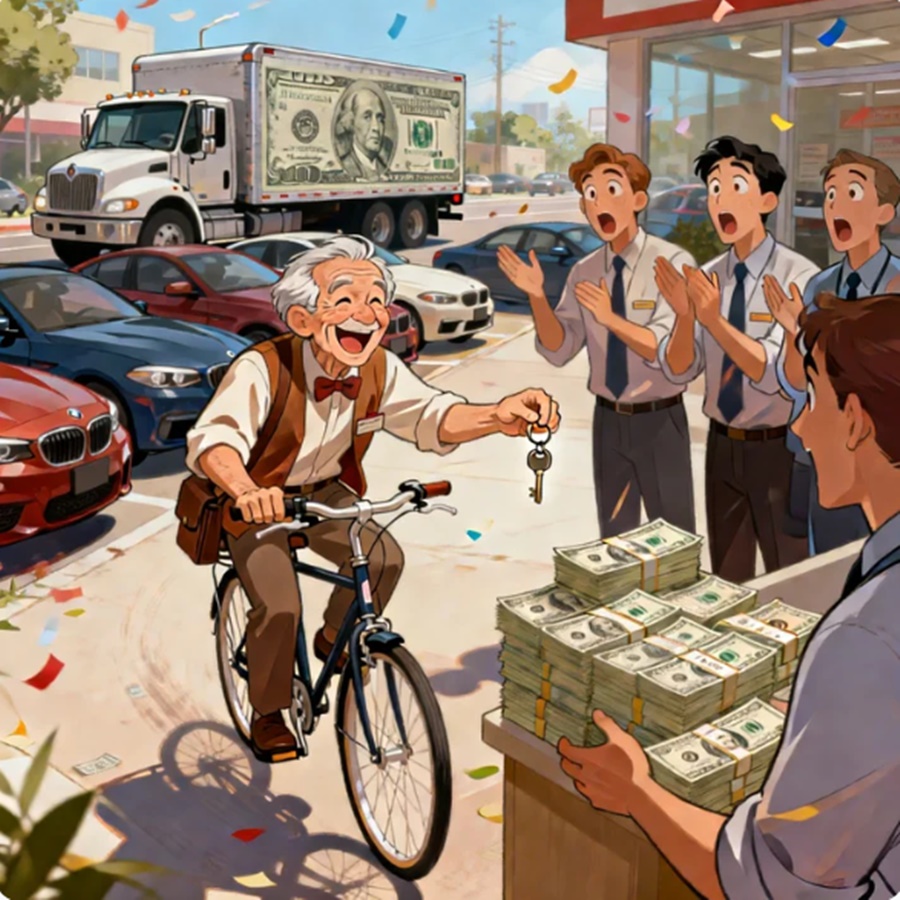 MINALIIT NG SALESMAN ANG LOLO NA NAKA-BIKE LANG — PERO NANG DUMATING ANG TRUCK NG PERA, BUMILI SIYA NG 10 KOTSE CASH PARA IPAMIGAY SA MGA EMPLEYADO NIYA