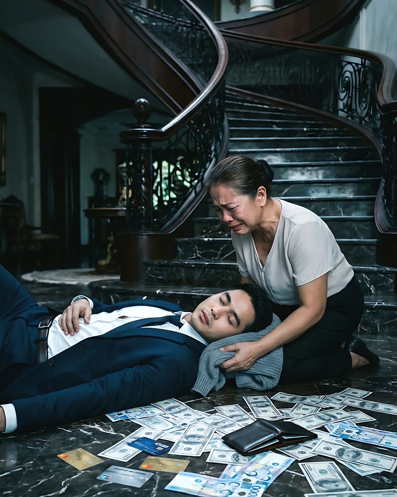 Nahulog ako at gumulong pababa sa humigit-kumulang sampung hakbang ng hagdan. Tumama nang malakas ang aking balikat at likod sa matigas na marmol na sahig, at nahulog mula sa aking bulsa ang aking makapal na pitaka na naglalaman ng daan-daang libong cash at mga platinum credit cards.