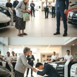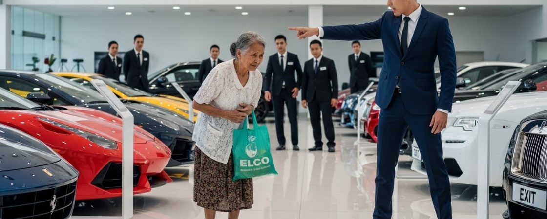 OLD BILLIONAIRE ACCEPTS BEGGING IN LUXURY CAR DEALERSHIP AND IS KICKED OUT BY SALESMAN — BUT EVERYONE IS STOPPED WHEN GENERAL MANAGER ARRIVES AND KNEELS IN FRONT OF HER