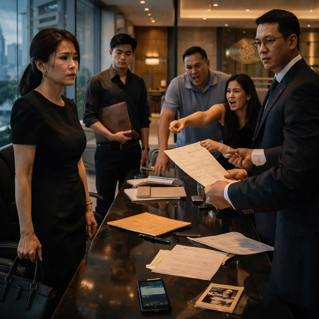 Nasa unahan ang abogado—si Atty. Navarro. Nasa edad-kuwarenta, nakasalamin, mukhang sanay sa away ng mayayamang pamilya.
