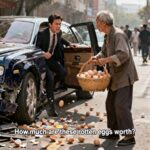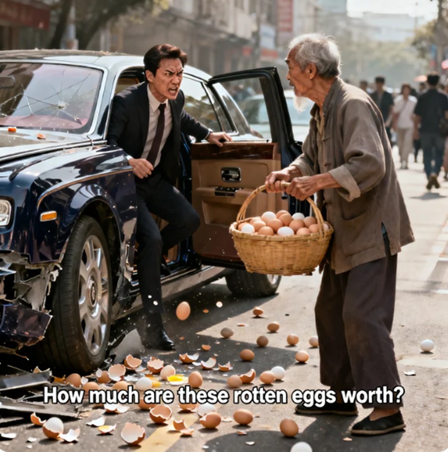 The director’s luxury car crashed into an old man carrying eggs, which scattered everywhere. Annoyed, he got out of the car and replied, “How much are these rotten eggs worth?” Exactly three days later, he was fired from his job.