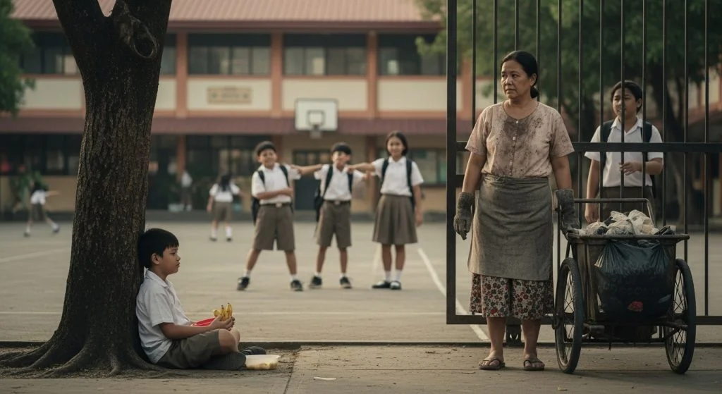 Tuwing recess, mag-isa lang si Benjie sa ilalim ng puno. Ang baon niya ay nilagang saging o kamote na pinaghirapang bilhin ni Aling Rosa. Habang ang iba ay kumakain ng burger, si Benjie ay tinitiis ang gutom at hiya.